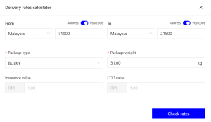 You can filter item type BULKY for packages more than 30kg, compare and book the cheapest or the fastest courier service in Malaysia with Delyva Now Check Rates.